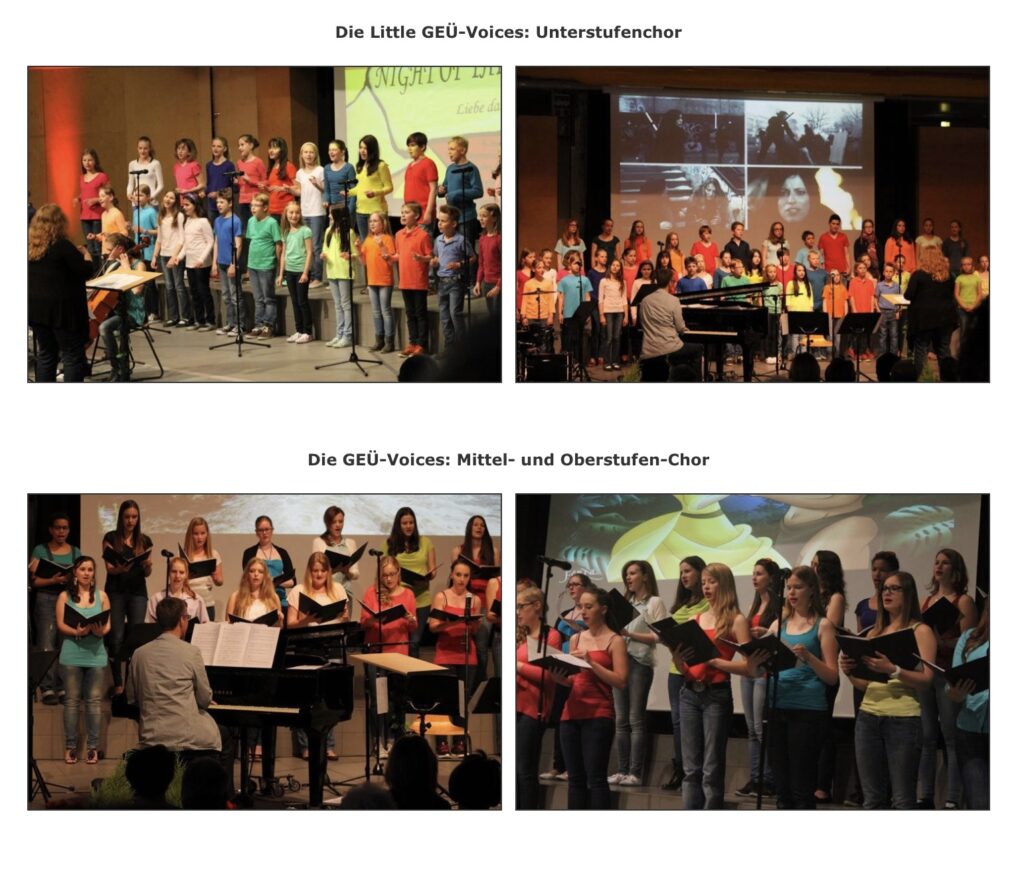 Unsere Chöre – die GEÜ-Voices und die Little-GEÜ-Voices – kann man bei fast allen Konzerten des GEÜ live erleben: Bei der Begrüßung der neuen Mitschülerinnen und Mitschüler zu Schuljahresbeginn, beim Tag der offenen Tür, den UNESCO-Projekttagen oder bei unseren zahlreichen weiteren Konzerten im Lauf des Schuljahres.