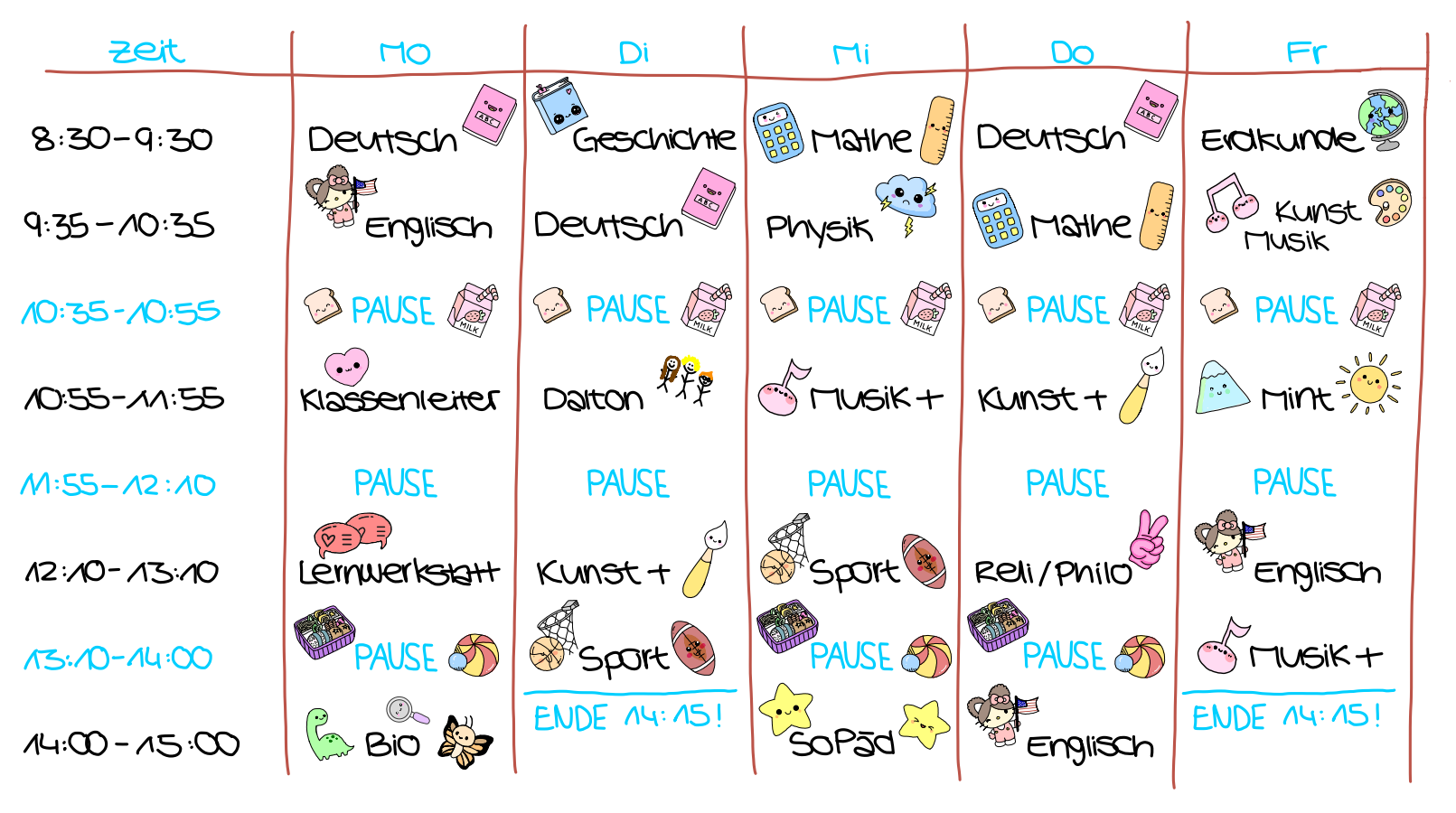 Es gibt verschiedene Pausenzeiten am Tag. Täglich gibt es eine 15min und 20 min Pause. Und an langen tagen natürlich auch eine 50Minütige Mittagspause.