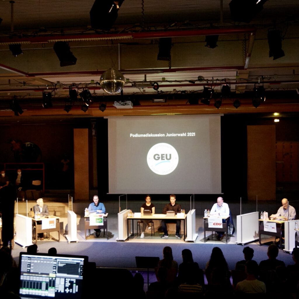 Im Rahmen der Juniorwahl finden am GEÜ auch Podiumsdiskussionen statt, die von engagierten Schülerinnen und Schülern geleitet werden. Zur Bundestagswahl 2021 konnte unsere Schulgemeinde beispielsweise Zeuge einer intensiven Debatte zwischen den Direktkandidatinnen und Direktkandidaten der antretenden Parteien werden.