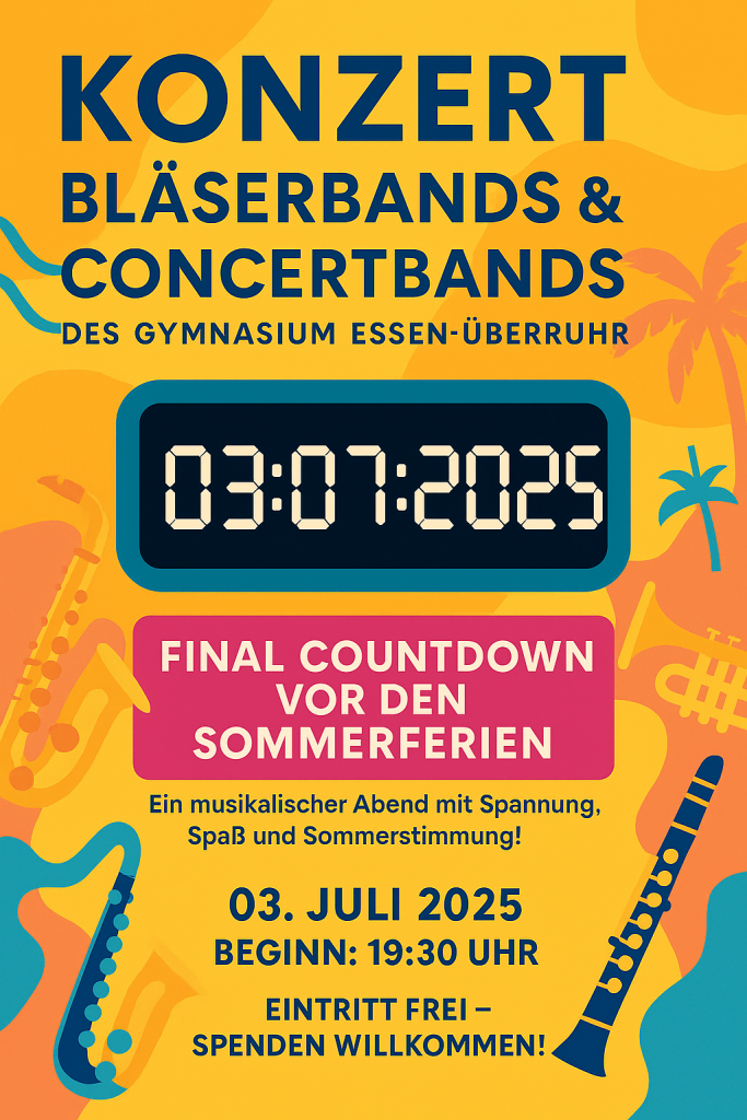Wir starten den Final Countdown vor den Sommerferien und möchten Sie mit einem kurzweiligen Abend auf die schönste Zeit des Jahres einstimmen. Freuen Sie sich auf mitreißende Musik und tolle Darbietungen! Die Bläserklassen des GEÜ freuen sich riesig auf Ihren Besuch – lassen Sie uns gemeinsam den Sommer feiern!